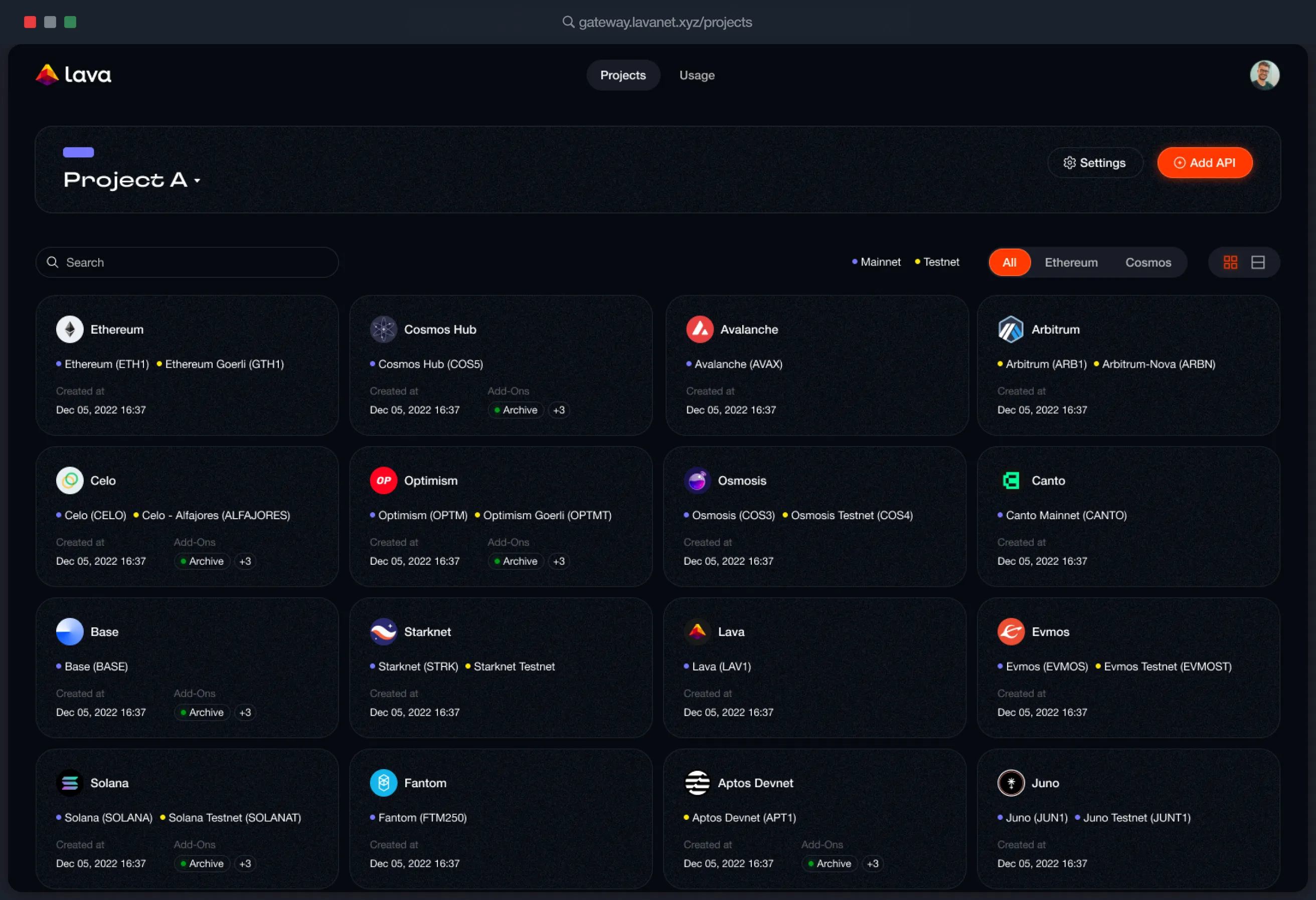 Anyone can permissionlessly add modules to Lava so the network can serve in-demand APIs and chains. Lava is a one stop shop for RPC & APIs.